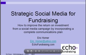 ECHO Fundraising provides experienced consulting services for non-profits interested in improving their return on investment from social media and online giving campaigns.  ECHO delivers complete interactive assessments, recommends strategy and provides professional support previously available to only the largest institutions.   ECHO helps even small non-profits utilize best practice strategies and improve their fundraising results with easy to implement social media techniques.